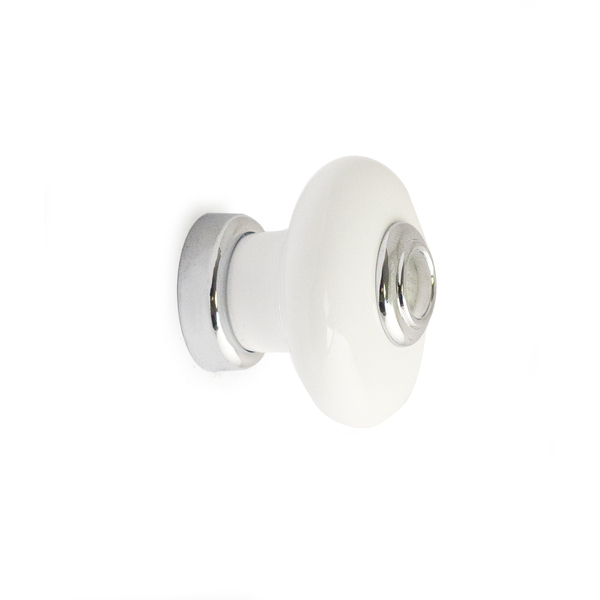 Knott av hvit porselen. Krom detaljer. Ø37mm. Knott i tradisjonell stil som passer til skuffer, skap/- og kjøkkendører. Leveres inkludert skruer.