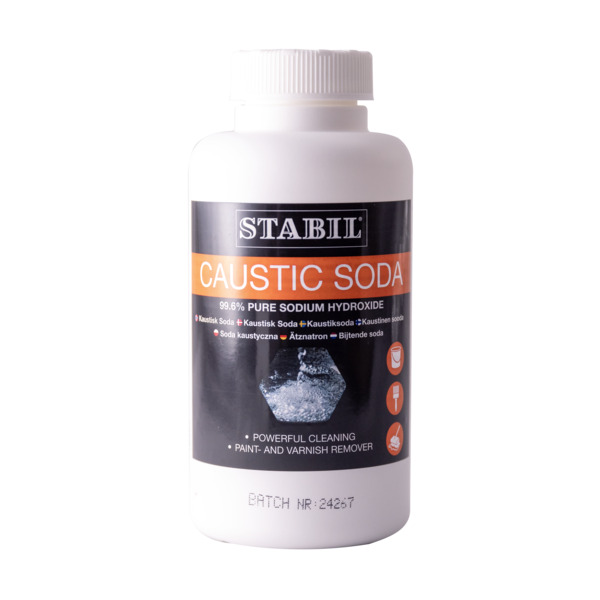 Stabil Caustic Soda er et effektivt rengjøringsmiddel som også brukes til fjerning av oljemaling og andre malingstyper, luting av fisk og treverk, og til å lage hjemmelaget såpe. Ideelt for rengjøring av ølbrygging utstyr, og som grovrengjøring i garasjer etc. Løser opp fastbrent fett. Skal ikke brukes på glass, aluminium, kobber, messing og edeltre.