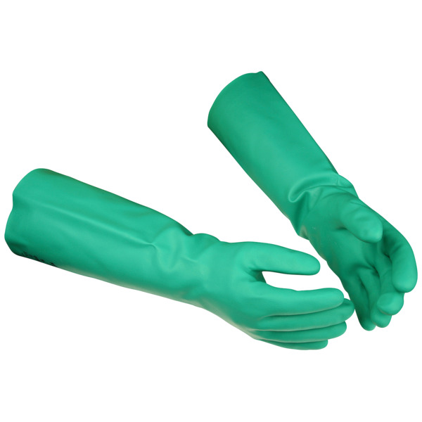 Kjemikaliehanske i nitril. Lengde 45,5 cm Tykkelse 0,56 mm Næringsmiddelgodkjent I samsvar med EN 388 4102X, EN 374-1 Type A AGJKLPT