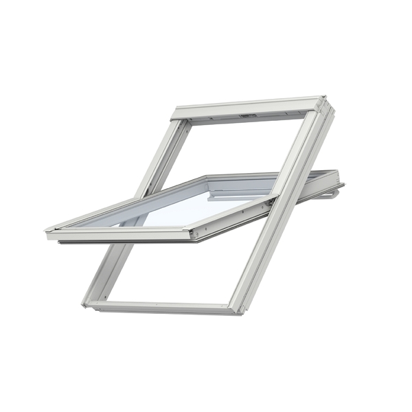 VELUX midthengslet takvindu i hvitmalt furu. NCS S 0500-N. Glasset er herdet utvendig og laminert på innsiden. Leveres som standard med 3-lags isolerglass(66) for god u-verdi, alternativt --67 glass for U-verdi 0,83. Utvendig bekledning i aluminium, RAL 7043. VELUX takvinduer kan benyttes i skråtak mellom 15-90°. Den unike gripelisten øverst fungerer både som åpne/lukkemekanisme og som lufteventil. Spesialmål på forespørsel.