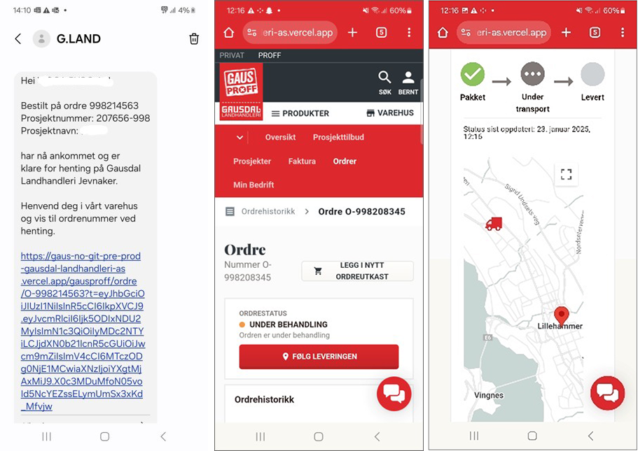 I SMSen er det oppgitt ordrenummer, prosjektnummer og prosjektnavn, og hvilken status ordren har (som nevnt over). I meldingen er det også en link, for å følge ordren og informasjonen tilknyttet ordren.
