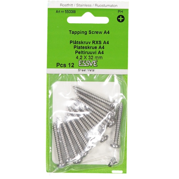 ESSVE Plateskrue brukes ved montering i tynnplater og krever oftest forboring. Skruen har rundt hode, Pozidrive, er gjengepressende og produsert med syrefast overflatebehandling. Plateskrue Syrefast A4 Dim: 4,2x32 mm Antall i pakken: 12 stk Hovedmateriale: A4 Syrefast - C5 - Utendørs Panhode PZ2