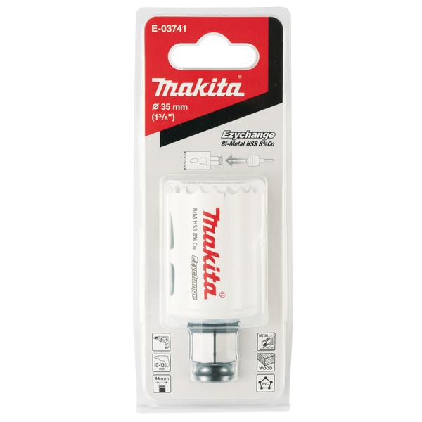 EZYchange er en serie hullsager med hurtigfeste slik at hullkoppene enkelt kan settes på og tas av drillen. Hullkoppene er 44mm dype og har store åpninger på sidene slik at man enkelt kan fjerne materiale etter hulltaking. EZYchange er en serie hullsager hvor adapteret som du fester i drillen har et hurtigfeste slik at hullkoppene enkelt kan settes på og tas av. Hullkoppene er 44mm dype og har store åpninger på sidene slik at man enkelt kan fjerne materiale etter hulltaking. Hele det ytterste feltet av hullsagen inkludert sagtennene er laget med HSS stål tilsatt kobolt for å forlenge levetiden. Det finnes forskjellige senterbor til forskjellige materialer.