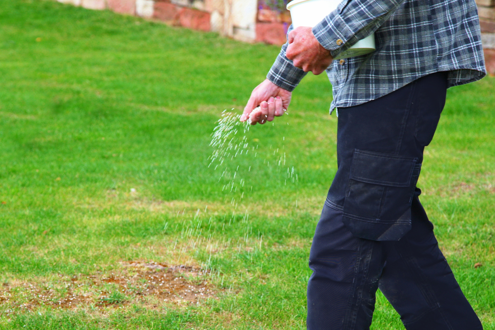 Vent med å gjødsle til de nye gress-spirene er et par centimeter høye. Da kan du gi dem en omgang med gjødsel for å sette skikkelig fart på veksten.